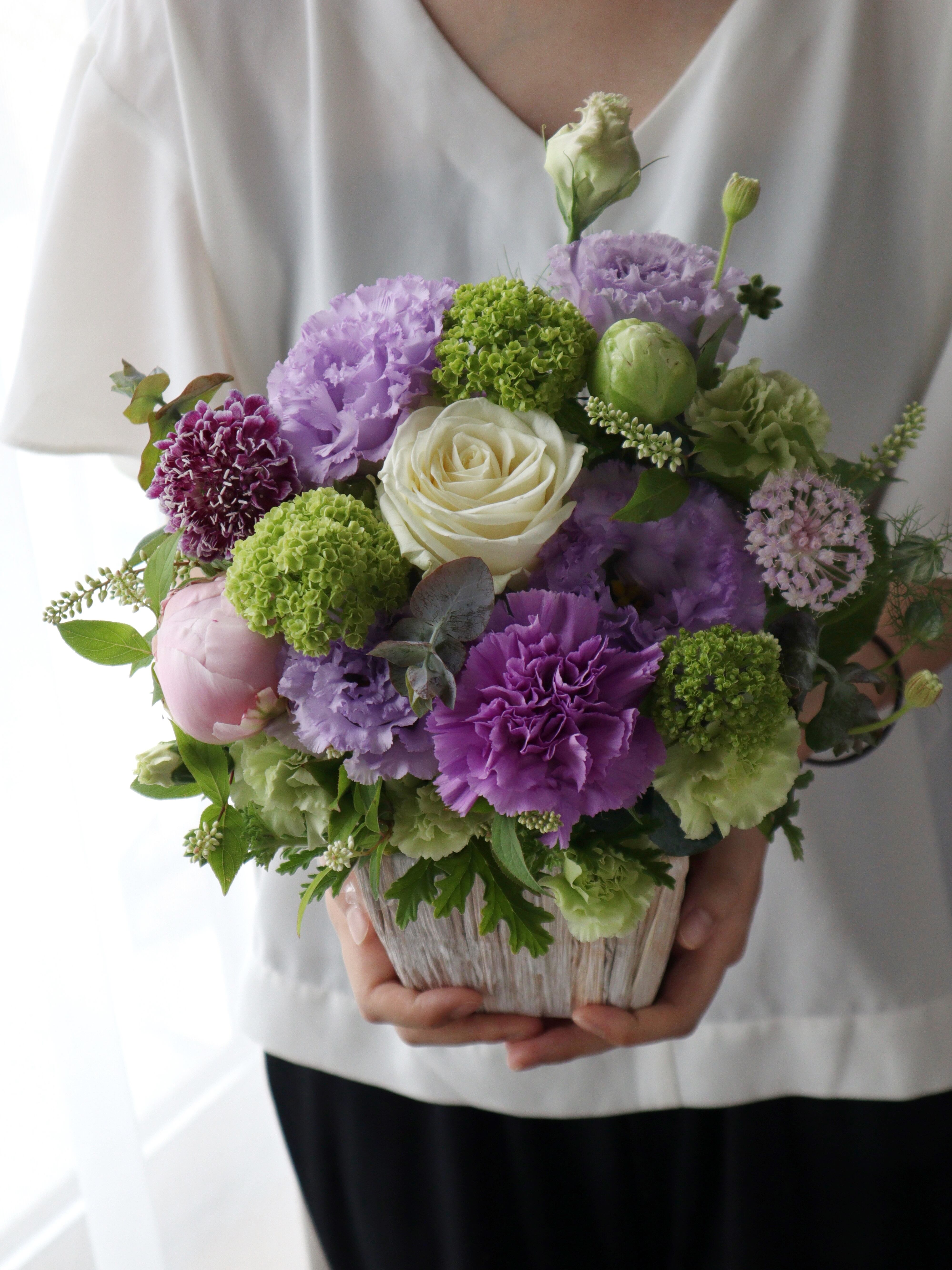 季節の花をはじめとしたその日のおすすめの花を直接目で見て仕入れてお作りします。